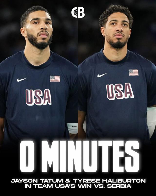 事实上,这已经不是塔图姆第一次被 DNP,塔图姆和哈里伯顿两次对阵塞尔维亚都没有机会上场。第一次是奥运预选赛的第一站,当时美国男篮。 110-84 很容易杀死塞尔维亚,两位年轻球星在场边。 VIP 座位看了一整场比赛。