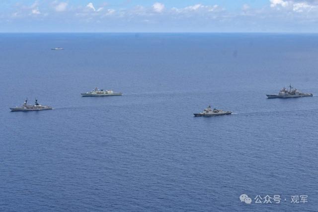根据美国海军协会网站(USNI)8 月 8 日报报道,美菲加澳四国于四国 7 日本在南海举行联合军事演习,出动 4 护卫舰。在美国、菲律宾、加拿大和澳大利亚学习期间,我们的军舰“观看”。菲律宾军方声称,三艘中国海军护卫舰“跟随”了四国参加海上演习的船只。由于中国海军的“跟随”,四国参加演习的水手甚至被禁止在甲板上使用手机。