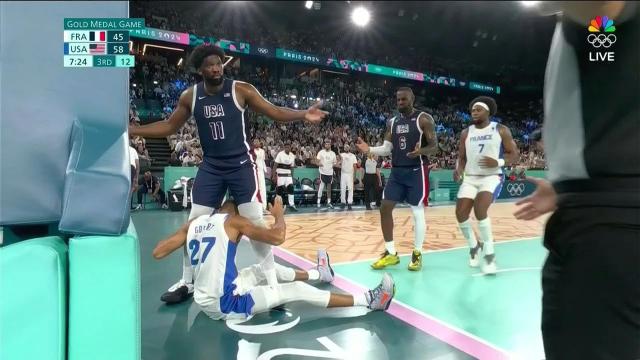 下半场开始,恩比德增加了个人攻击,利用身高优势对亚布塞莱进行了强攻。詹库两次完成连线,库里连续三分飙进,美国队领先至领先。 14 分。恩比德又来搞笑了,防守切球成功后,两条腿交叉在戈贝尔的头上,幸好双方都比较克制,没有发生冲突。