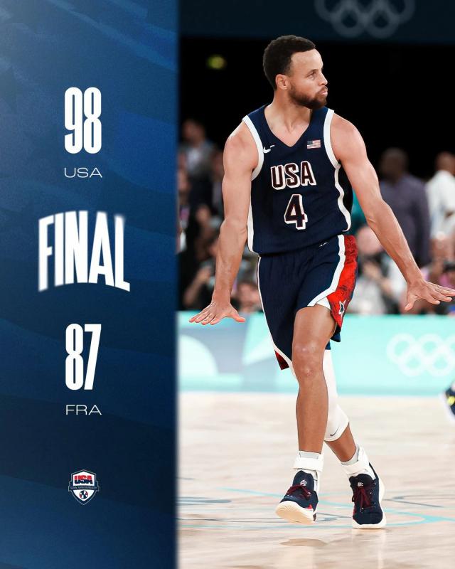 北京时间 8 月 11 早上,巴黎奥运会男篮决赛:美国队 98 比 87 击败主办国法国队,赢得奥运冠军。美国首发:库里、布克、杜兰特、詹姆斯和恩比德。法国首发:科尔迪尼耶、尼利基纳、巴图姆、亚马和亚布塞莱。