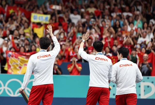 ▲ 8 月 9 日本,中国队选手王楚钦、马龙、樊振东(从左到右)在颁奖典礼上向观众问好。(新华社)
