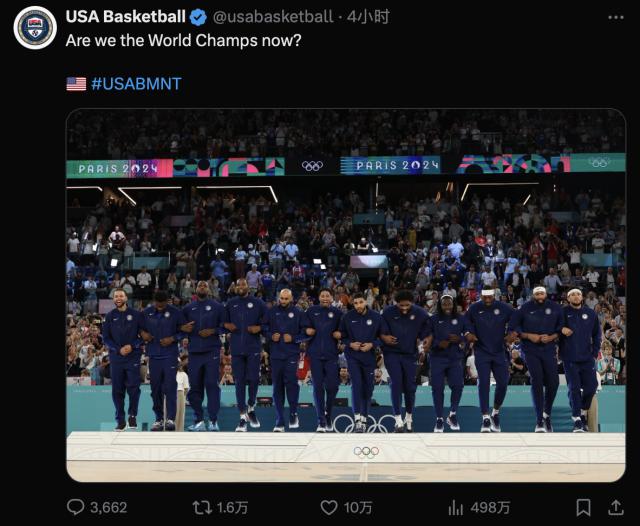 同样令人怨恨的还有美国男篮官网,赛后晒图,问道:“我们现在是世界冠军吗?”