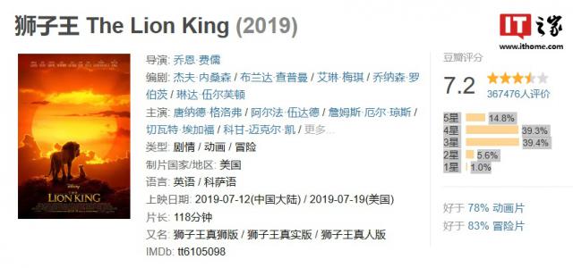 电影《狮子王》《真狮版》 2019 年 7 月亮在大陆上映,时间 118 分钟,现在豆瓣评分 7.2 分。