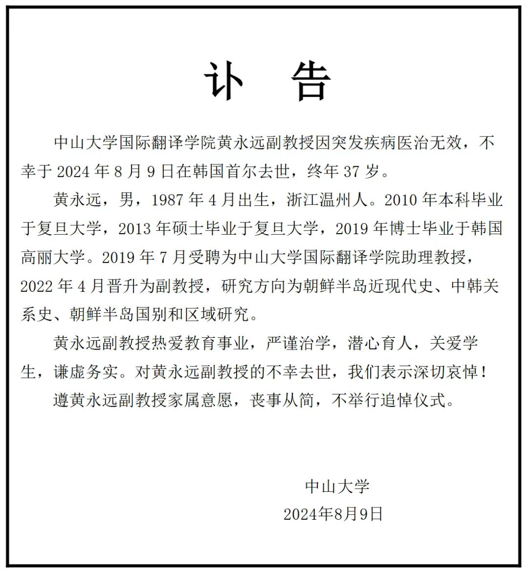 8月9日晚,中山大学国际翻译学院官方微信号发布消息称,韩国历史学者、中山大学国际翻译学院朝鲜语系副教授黄永远因突发疾病无效,于2024年8月9日在韩国首尔去世,终年37岁。
