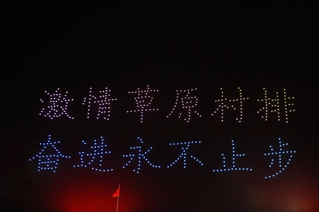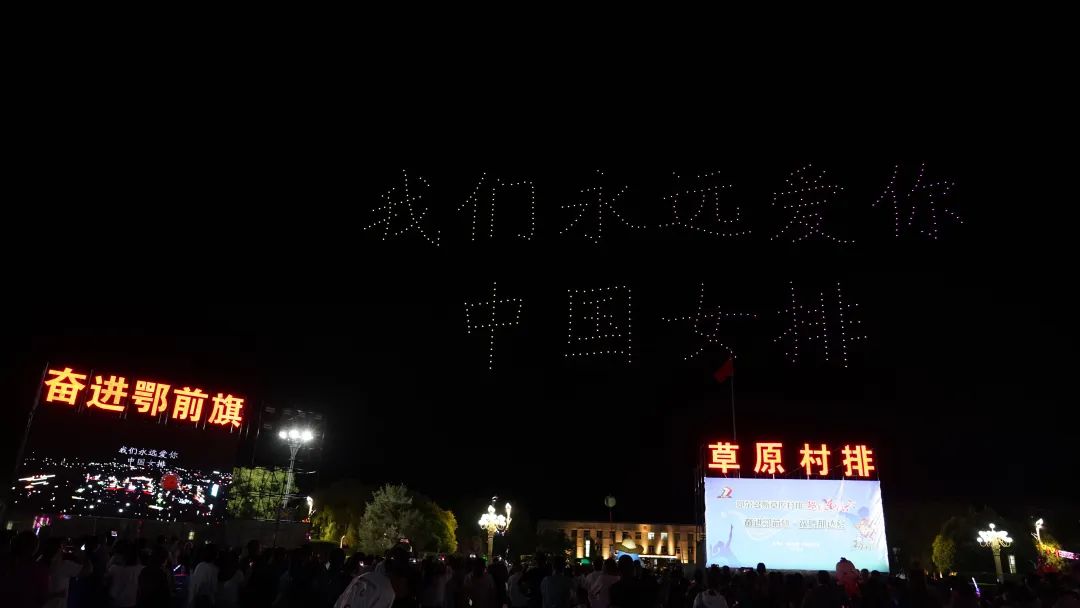 在华灯初上,当数百架无人机在宁静的城市上空举行了一场精彩的视觉盛宴。依次呈现“跟随幸福中国”、“暖城鄂尔多斯”、“为鄂前旗标志而战”、“草原村排标志”、“我们永远爱你中国女排”、“吃羊排看草原村排”等字样和图案。每个人都举起手机拍照、录像,跟随无人机的表演欢呼,共同欣赏这场科技与艺术完美融合的“高空光影秀”。
