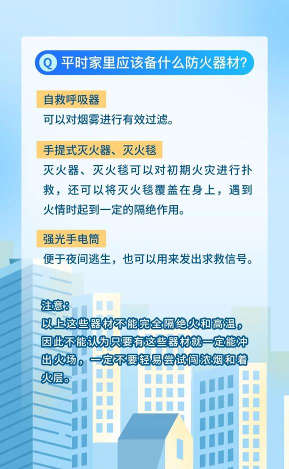 简单的消防逃生工具,如灭火器、灭火毯、防烟面罩、逃生绳、多功能手电筒、消防手套等。