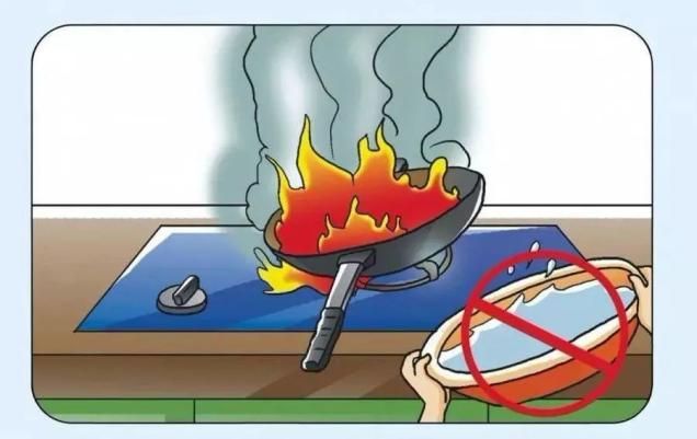 油锅着火,用灭火毯或锅盖盖,或倒入青菜,不要用水灭火。