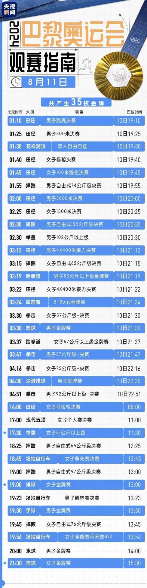 八月十一日是2024年巴黎奥运会最后一个比赛日,将有35枚金牌。