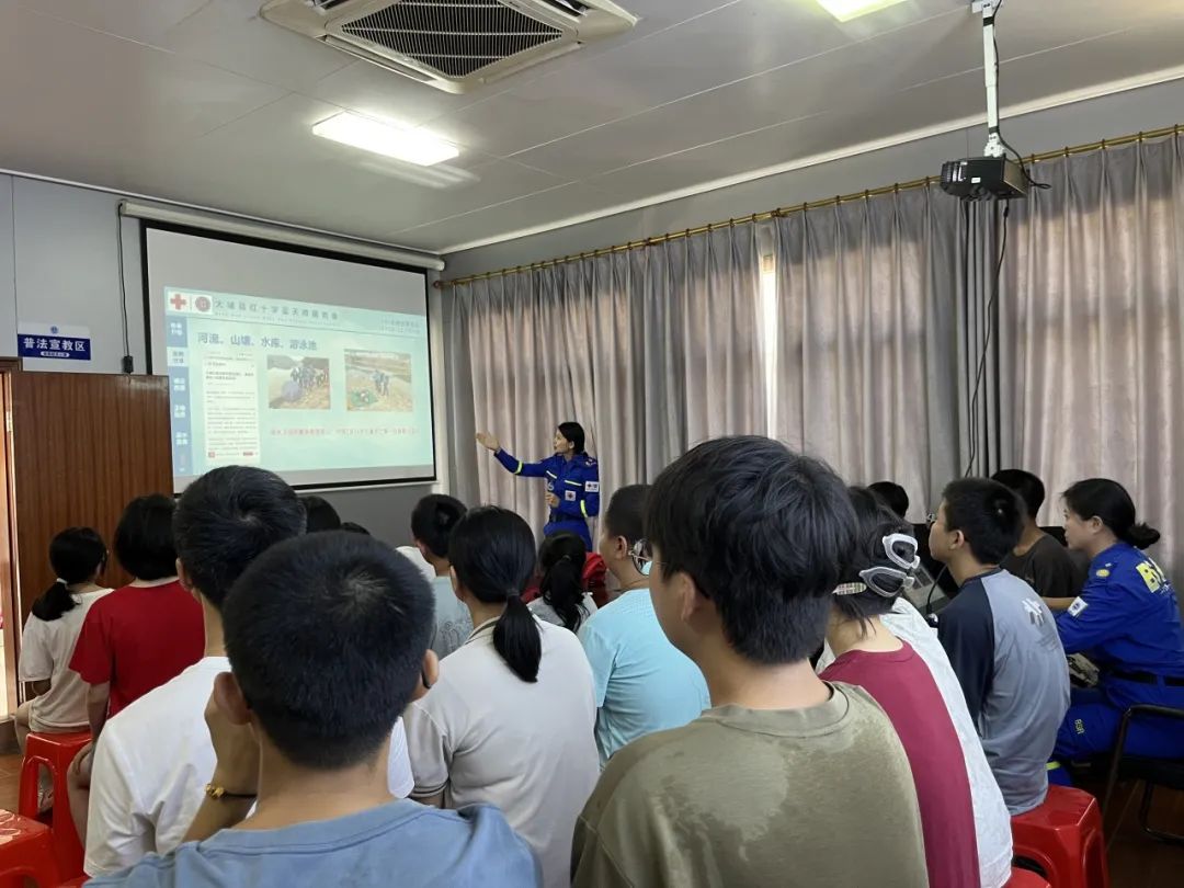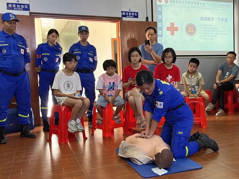 随后,大埔红十字蓝天救援协会选择了图文讲解、互动问答、模拟演练等有趣的教学模式,传授了防溺水的基本安全知识,并现场演示了穿救生衣、扔救生绳、心肺复苏等实用教学。活动气氛热烈,孩子们专心听讲,家长们纷纷称赞!