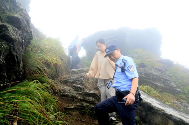9点20分,雾锁山,可见度极低。一个110指令打破了原来的检查节奏。在铜鼓北麓海拔超过1500米的风车露营基地,一些游客停留在山顶,无法安全返回。余欢和同事迅速改变路线,赶往事发现场。