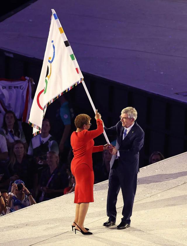 ↑卡伦,洛杉矶市长 · 在会旗交接仪式上,巴斯(左)与国际奥委会主席巴赫。新华社记者 张帆 摄