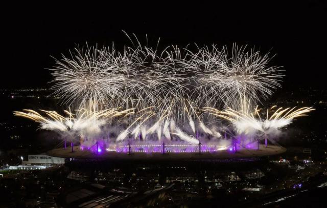 ↑在闭幕式上,运动员欣赏烟花表演。新华社记者 李明 摄