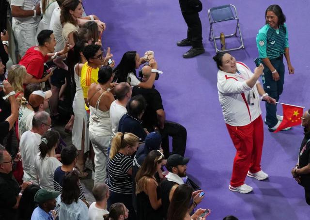 ↑在闭幕式上,中国体育代表团成员李雯雯(右)与观众合影。新华社记者 郑焕松 摄