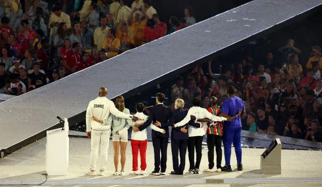 ↑巴赫(右四)国际奥委会主席和巴黎奥组委会主席托尼 · 在闭幕式上,埃斯坦盖(左四)与运动员代表一起举行。新华社记者 张帆 摄