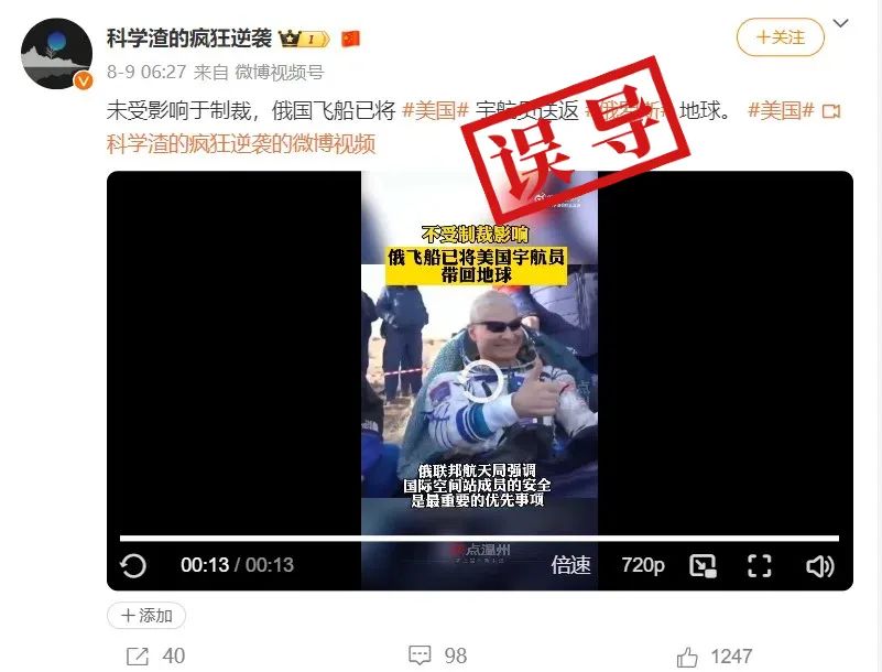 明查|俄罗斯飞船已经把停留在太空的美国宇航员送回来了?这是张冠李戴的旧闻