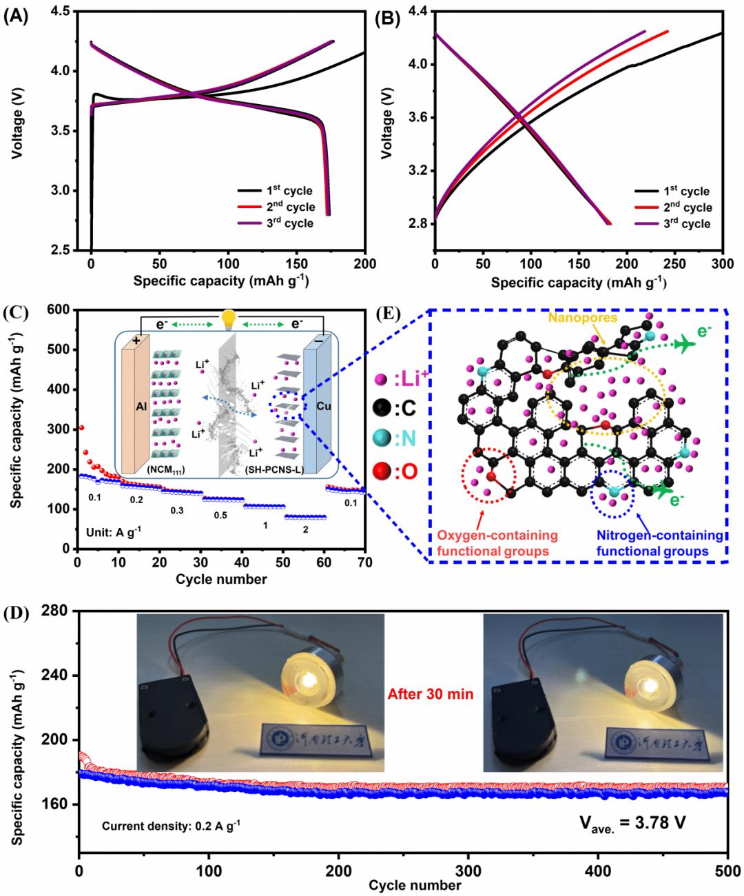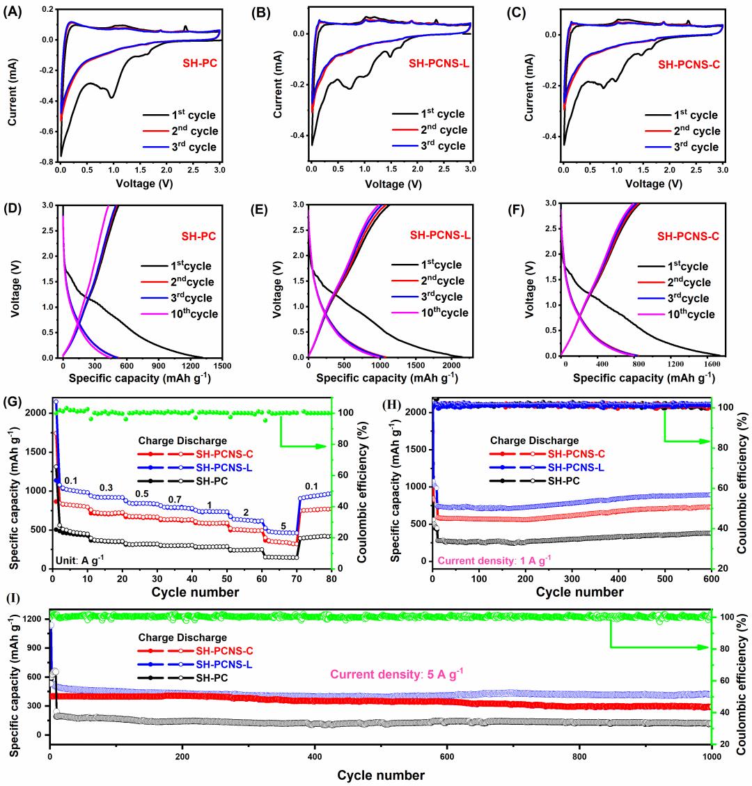 本研究以腐植酸钠为前驱体,采用冰模板诱导拼接结合炭化策略,实现了多孔碳纳米片的千克规模制备。多孔碳纳米片具有层次分明的微/中孔结构、二维块状形态和大量含氧/氮官能团。得益于其独特的微观结构,锂电池的负极表现出优异的锂离子储存特性。此外,SH-PCNS-L//NCM111全电池还具有较高的能量密度。由于腐植酸钠资源丰富,价格低廉,制备多孔碳纳米片的过程柔软简单,获得的多孔碳纳米片具有优异的锂储存特性,可以为主孔碳纳米片的工业化和商业化奠定基础。