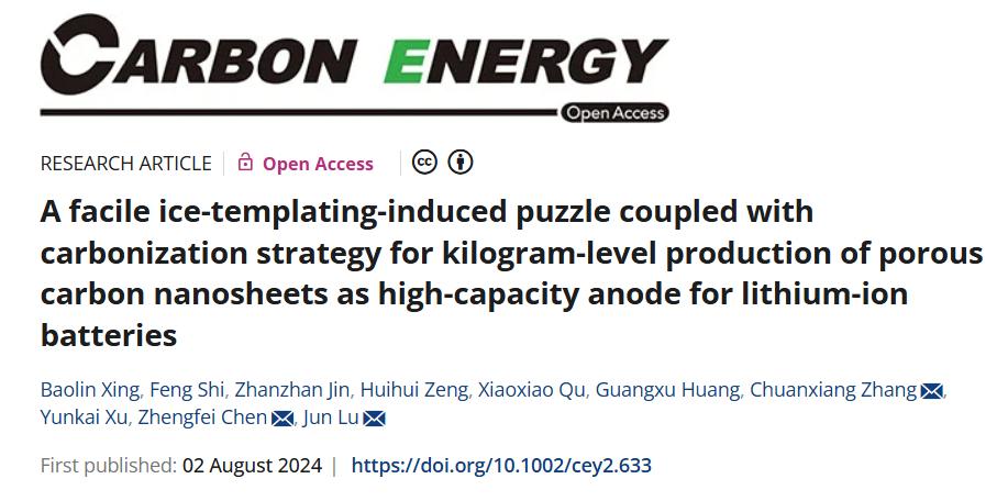 河南理工大学邢宝林、浙江大学宁波理工学院陈正飞等人选择冰模板诱导拼接结合炭化策略,以腐植酸钠为前驱体,实现多孔碳纳米片千克规模制备。这项研究的结果是“A facile ice-templating-induced puzzle coupled with carbonization strategy for kilogram-level production of porous carbon nanosheets as high-capacity anode for lithium-ion batteries"问题发表于《Carbon Energy》。