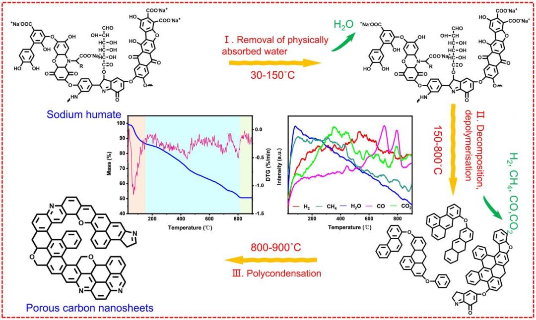 1. 以腐植酸钠为前驱体,采用冰模板诱导拼接结合炭化策略,实现了多孔碳纳米片的千克规模制备,揭示了其形成机制。