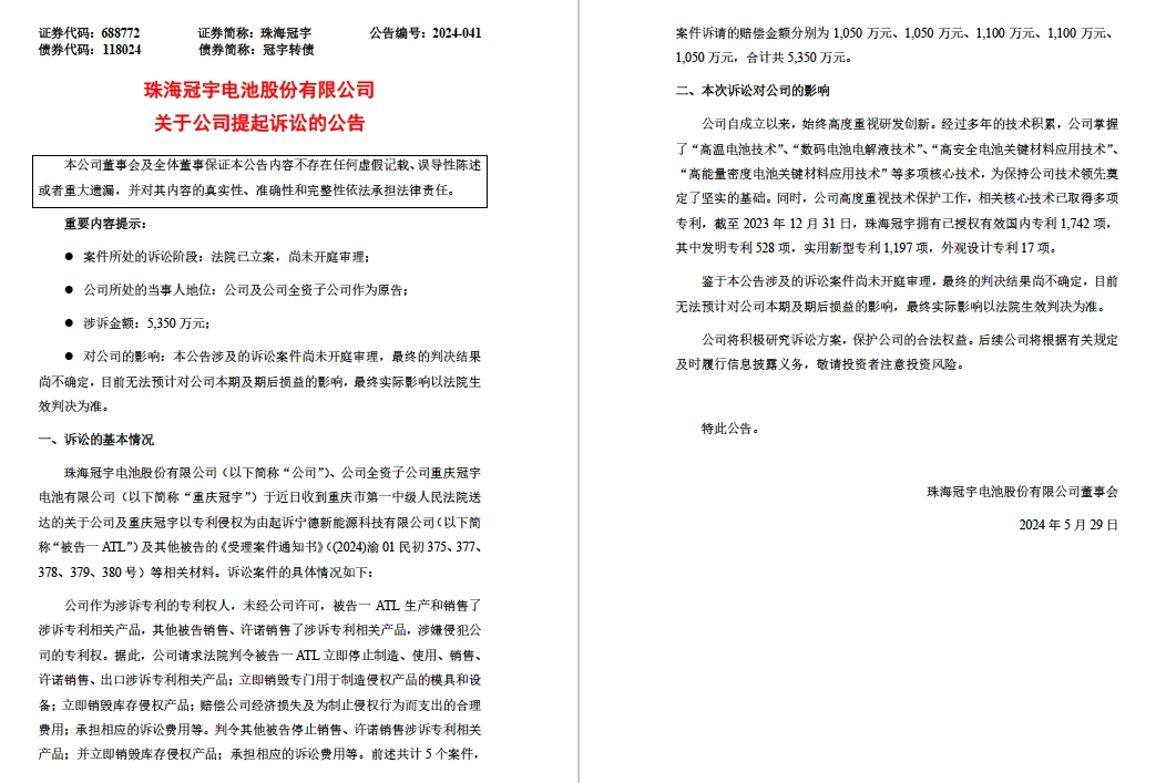 从2021年开始,ATL多次对珠海冠宇发起专利诉讼,涉案金额最高超过1亿元。一位接近珠海冠宇的人士告诉36碳:“双方打得很激烈,其他国家也有专利纠纷,其实是为了争夺客户。”今年5月,珠海冠宇宣布反击ATL。
