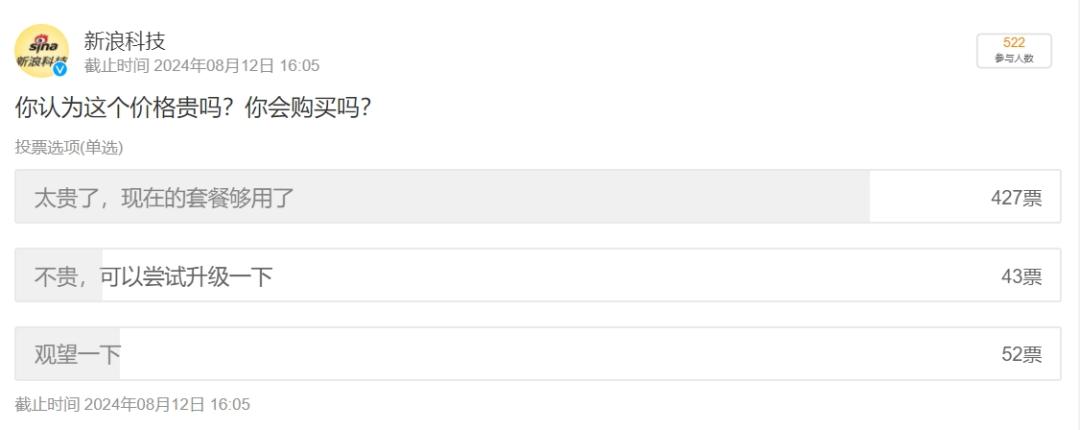 新浪科技发起了微博投票,关于是否购买5.5G套餐。截至8月5日晚,共有522名网友参与投票,其中近82%的网友认为太贵,现在套餐就够了;只有8%的网友认为不贵,可以尝试升级。