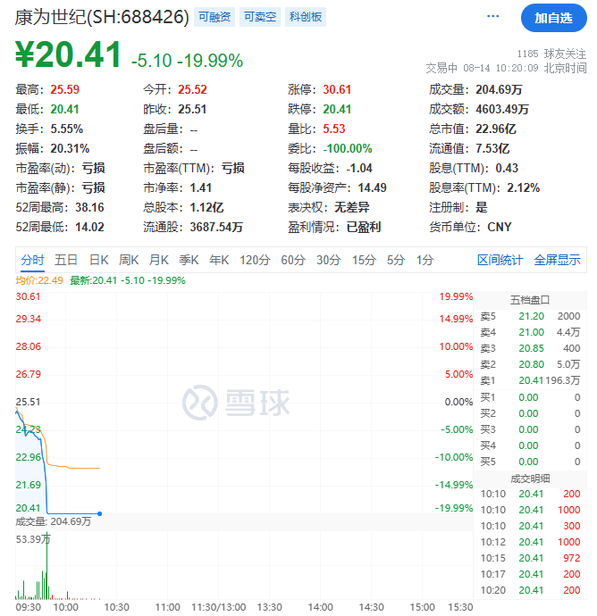 8月14日上午,康为世纪盘突然暴跌,直接跌至20CM跌停。截至发稿时,康为世纪仍未开盘,股价停留在20.41元/股。