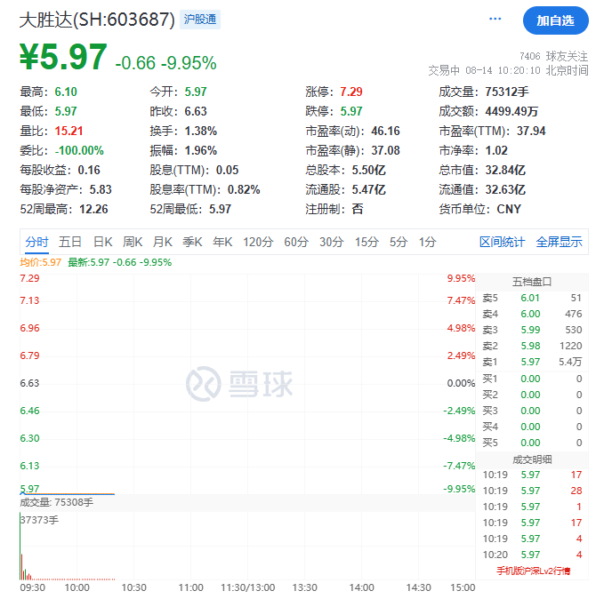 八月十四日上午,大胜达在集合竞价阶段下跌。截至发稿时,大胜达股价为每股5.97元,跌幅为9.95%。
