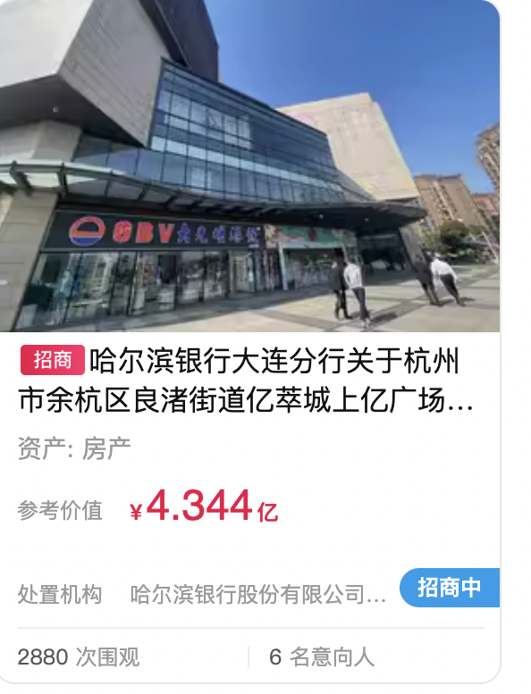 根据阿里资产平台公布的《哈尔滨银行大连分行关于杭州市余杭区良渚街道亿萃城上亿广场挂牌询价》内容,目标数亿广场建筑面积约5.4万。㎡,目前的状态是购物中心。2020年1月12日,由在建项目转为房地产,用于商业用地,使用权限为2051年7月26日。截至发稿时,平台显示有6名意向人。