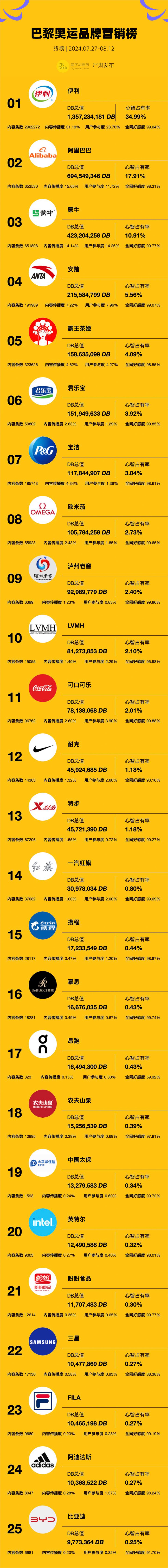 时间窗口为7月27日至8月12日,『数字品牌榜』通过分析2024年巴黎奥运会各类品牌在中国社交媒体上的相关数据,我们获得了最终版本的“巴黎奥运品牌营销榜”,试图从多个维度评估各品牌的营销情况,截取榜单前50名的主要数据进行展示。