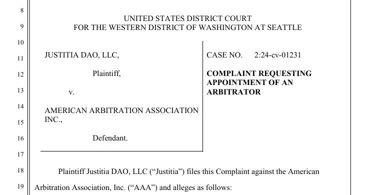 美国自治组织Justiatiaa在当地时间2024年8月12日 DAO LLC(以下简称Justitia)向华盛顿西区美国地方法院提出正式起诉,要求法官发出强制美国仲裁协会的命令。(American Arbitration Association,简称AAA)指定仲裁员裁定Justitia向亚马逊提出的索赔仲裁案。这起案件已由法院受理。