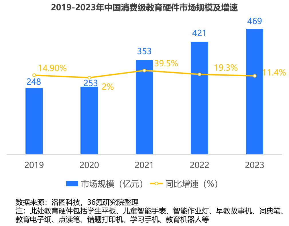 面向学生和家长的辅助教育多为消费智能教育硬件、在线教育产品和服务、学习应用和资源平台等软件系统,覆盖K12、素质教育、高等教育、职业教育等诸多领域。得益于AI,特别是自然语言理解(NLP)、知识图谱、深度学习、大模型等技术的创新,消费教育软硬件正在经历底层应用能力的升级。相关企业多以自主研发或生态合作的形式,围绕教育模式打造技术基础,以AI技术能力重塑教育流程,AI原生应用层出不穷。以学习平板电脑、字典笔、电子纸单词卡为代表的教育硬件,通过AI实现与用户的个性化互动,赢得了学生和家长的青睐。据洛图科技资料显示,2023年我国消费智慧教育硬件产品市场规模约为469亿元,同比增长11.4%,韧性增长趋势明显。