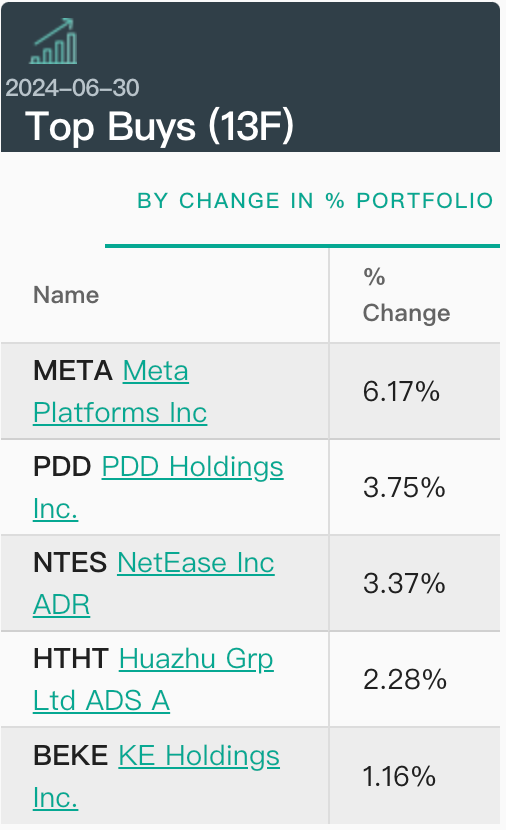与此同时,高毅大幅加持META,增长1900%,使其一跃成为第五大重仓股;高毅第二季度还买入了145.84万股,增长93.22%,使其成为第二大重仓股;买入网易44.47万股,增长124.15%;购买贝壳102.42万股,增长86.05%。