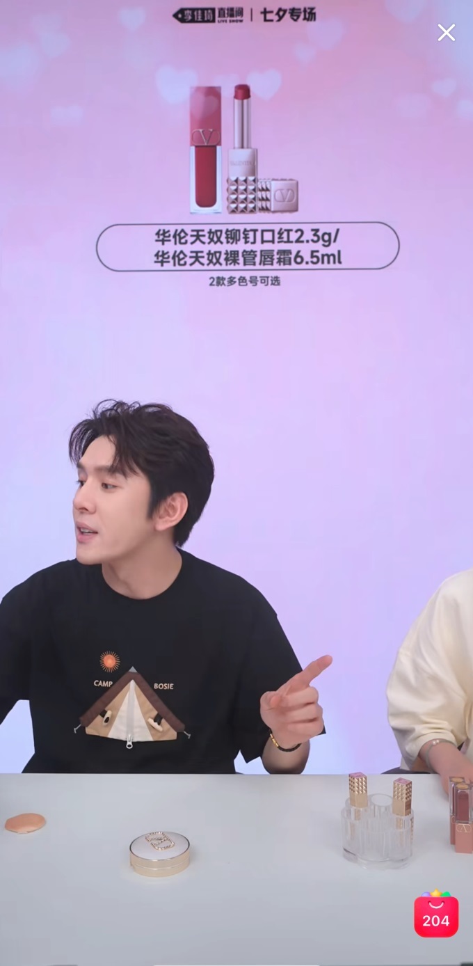 为了迎接中国情人节,李佳琦在直播间举办了一场口红节主题特别节目。主播面对镜头不断展示产品,改变色号,展示质感和着色效果。这次直播上架了近90个链接,每个链接的口红色号从两个到十几个不等。总共需要现场展示近1000支口红,以保证直播间用户能看到真实的色妆效果,更快地选择自己喜欢的产品。