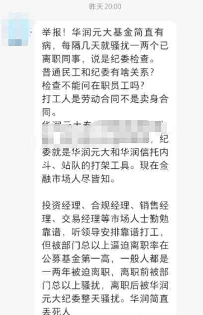 被员工举报!华润元大基金以纪委的名义骚扰离职员工