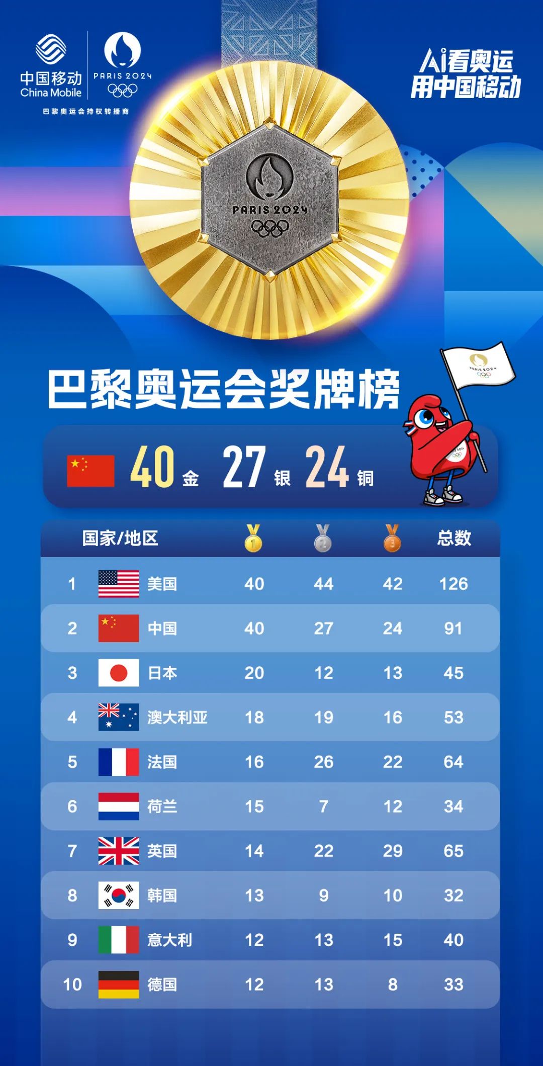 奥运会开始后,选手的赛场表现触动了每一位观众的心,也关系到品牌的押注结果。在本届巴黎奥运会上,中国国家队获得了如下金牌: