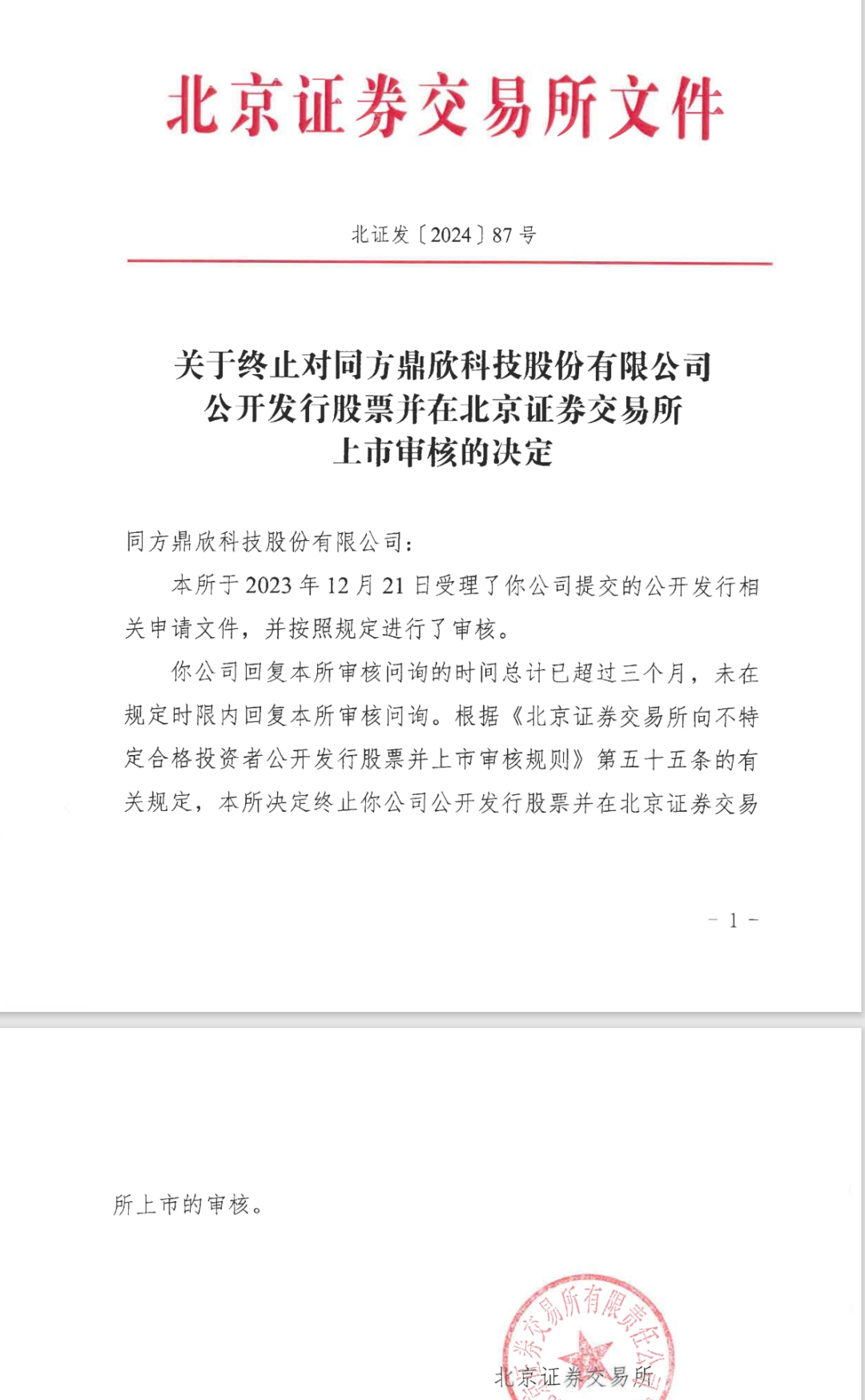 2024年8月12日晚,在新三板上市交易的同方鼎信科技有限公司(以下简称“同方鼎信”)发布公告承认,三天前的8月9日,他已收到《关于停止在北京证券交易所公开发行股票并审批同方鼎信科技有限公司上市的决定》(以下简称《终止决定》)。这次北交所上市之旅,长达一年多,以失败告终。