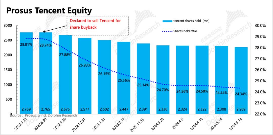 而且大股东在5月14日至今三个月内销售了3970万股,与上一个周期平均月销售节奏(每月1250万股)相比,略有加快。但由于腾讯回购注销力度较大(每月4000万),截至第二季度末,大股东持股比例变化不大,仍有24.34%。