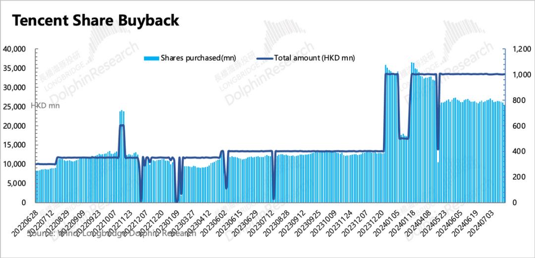 就回购量而言,腾讯继续增加回购量,环比增长250%。:第二季度回购了1.55亿股,消耗了523亿港元,回购的股份已经被取消,总股份比1Q24下降了0.4%。
