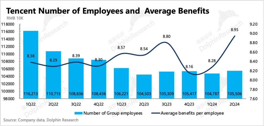虽然第二季度效率提升趋势再次被打破,但是海豚君仍然认为腾讯在中长期下仍有经营效率提升的潜力。一方面,目前员工规模绝对庞大,与目前完善的商业模式相比仍然臃肿;其次,AI等新技术短期内需要花费,但中长期会更有助于提高公司的内部效率。Q2员工的新增并不意味着腾讯进入了一个新的投资周期。考虑到社会效应和短期业务变化,滑动小步的推广仍然是股王的战略方向。