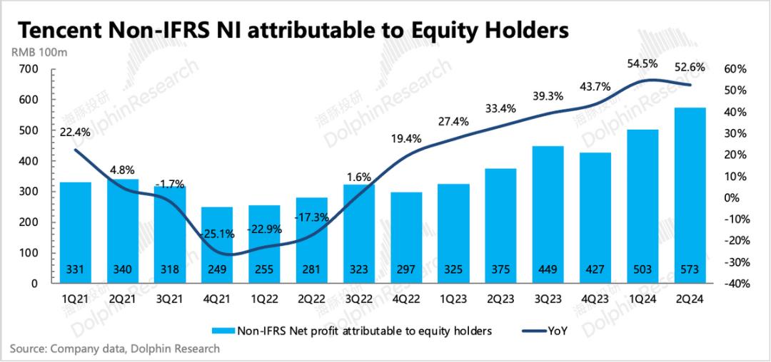 现已注销回购股份,截至第二季度末,集团总股权环比下降0.4%。市场看久腾讯的核心逻辑之一就是今年千亿回购计划。假设今年剩余的交易日继续按照每天10亿元的回购节奏进行回购(到目前为止还在继续),那么预计回购总额将超过1600亿港元。此外,估计股息330亿元,股东整体回报率仍高达5.6%,这是在降息周期的背景下吸引资金下注的重要原因。