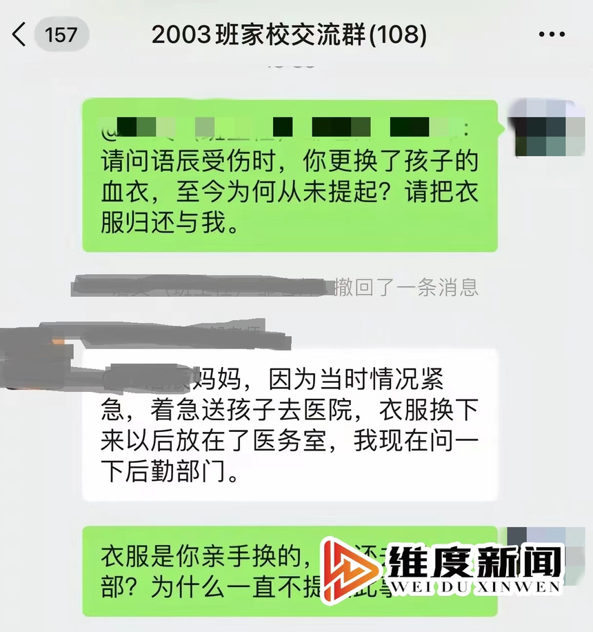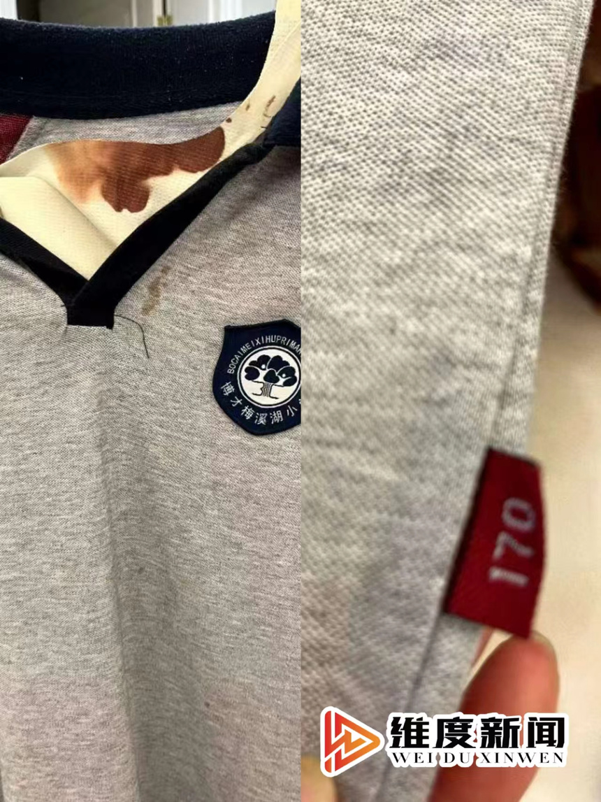 后来,郭女士发现孩子当天穿的校服尺寸是“170”,而早晨事发时身高不到1.5米,这件校服不是早上穿的。郭女士问班主任这件事,班主任承认“情况紧急,给孩子换衣服”。至于孩子原来的衣服,我还没有还给郭女士。