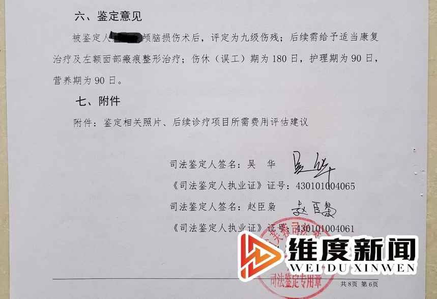 早晨先被送到校医办公室治疗,由于伤势严重,被送往医院治疗,然后转到中南大学湘雅二医院进行了5个多小时的脑部手术。根据郭女士向维度新闻提供的鉴定意见,早晨颅脑损伤后被评为9级残疾。