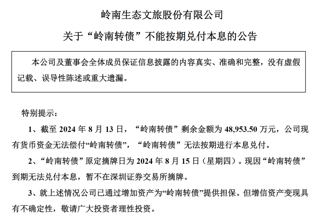 岭南股份表示,自2024年5月以来,公司多次在公司发布的相关“岭南可转债”通知文件中,结合自身经营情况和流动资产现状,对公司可能出现的兑现风险进行了风险提示。