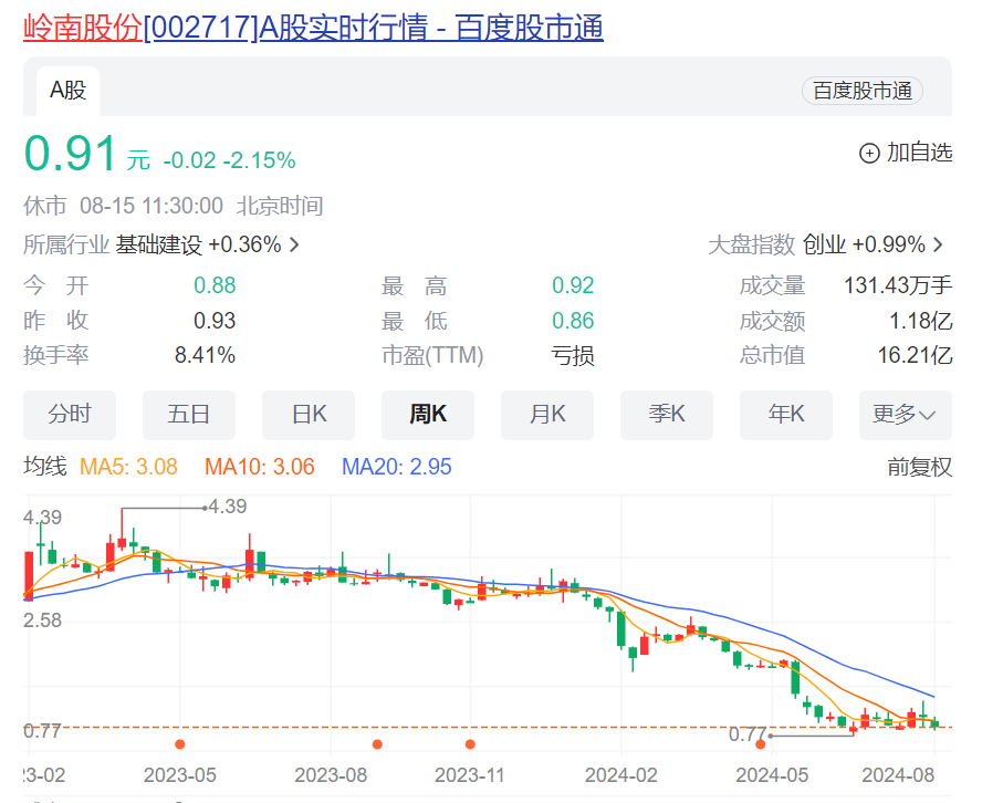 八月十四日晚,岭南股权(002717).SZ)公告称,截至2024年8月13日,“岭南可转债”剩余金额为4.89亿元。目前公司流动资产无法偿还“岭南可转债”,“岭南可转债”无法按时兑现本息。。