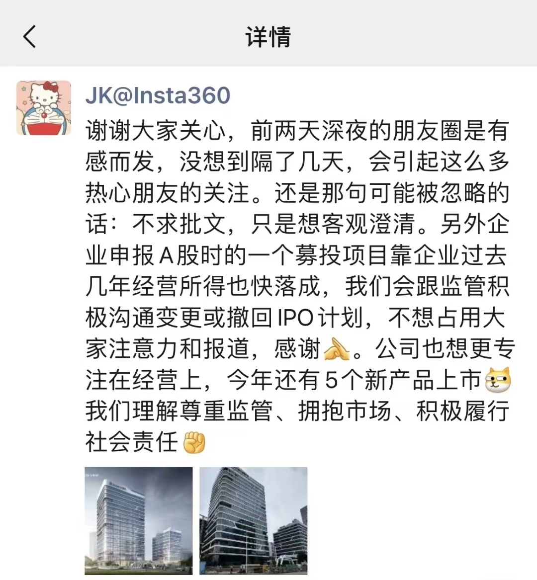 影石创新在深夜发布“短文”后表示,IPO计划将变更或撤销