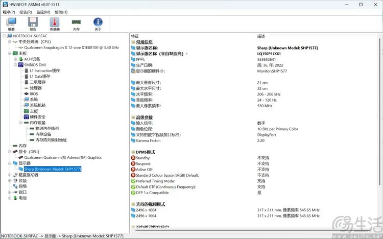 第一个是CPU信息。能看到,Surface Laptop Surfacee7使用 Pro 11同款骁龙X Elite X1E-80-100,它具备4P 默认主频3.4.4的8P二丛集12大核CPUGHz、峰值主频4GHz,集成1536ALUs、Adrenono峰值主频1250MHz X1 GPU。