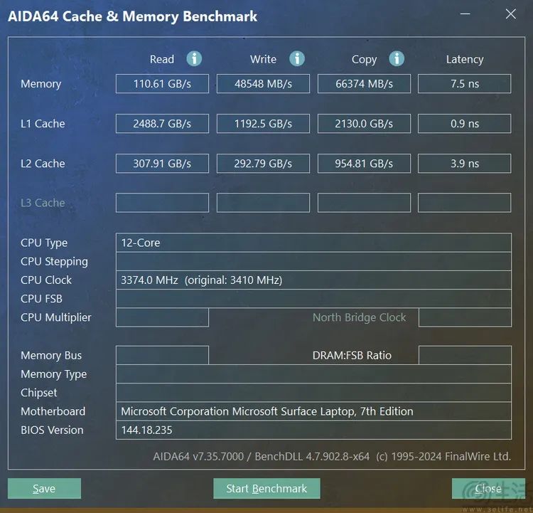利用AIDA64缓存检测工具对Surface进行检测 Laptop 可以看到7的CPU内存分系统性能,与常见的x86Cpu相比,骁龙X Elite的内部缓存带宽较小,但是内存延迟非常非常低,甚至比传统x86处理器的L3缓存延迟还要小。