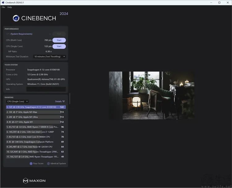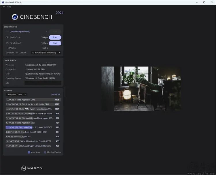 CINEBENCH进一步发展 2024渲染测试表明,在开启10分钟过热测试模式的前提下,Surface Laptop 7跑出比苹果M1 Max单核分数较高,其单核性能接近前代骁龙8cx Gen3的两倍。而且多核渲染性能接近M1。 Max,与此同时,低压x86Cpu显著超过了核心数量。