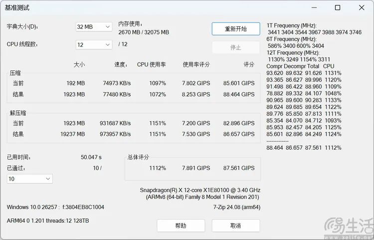 第一,是最基本的解压缩测试。值得注意的是,现在7ZIP已经有了原生ARM64版本,而WinRAR只有x64版本,所以这两个软件的检测差异,以及它们分别与x86平台的对比,从某种程度上可以反映出当前的Windows。 on 代码转译中ARM系统的效率表现。