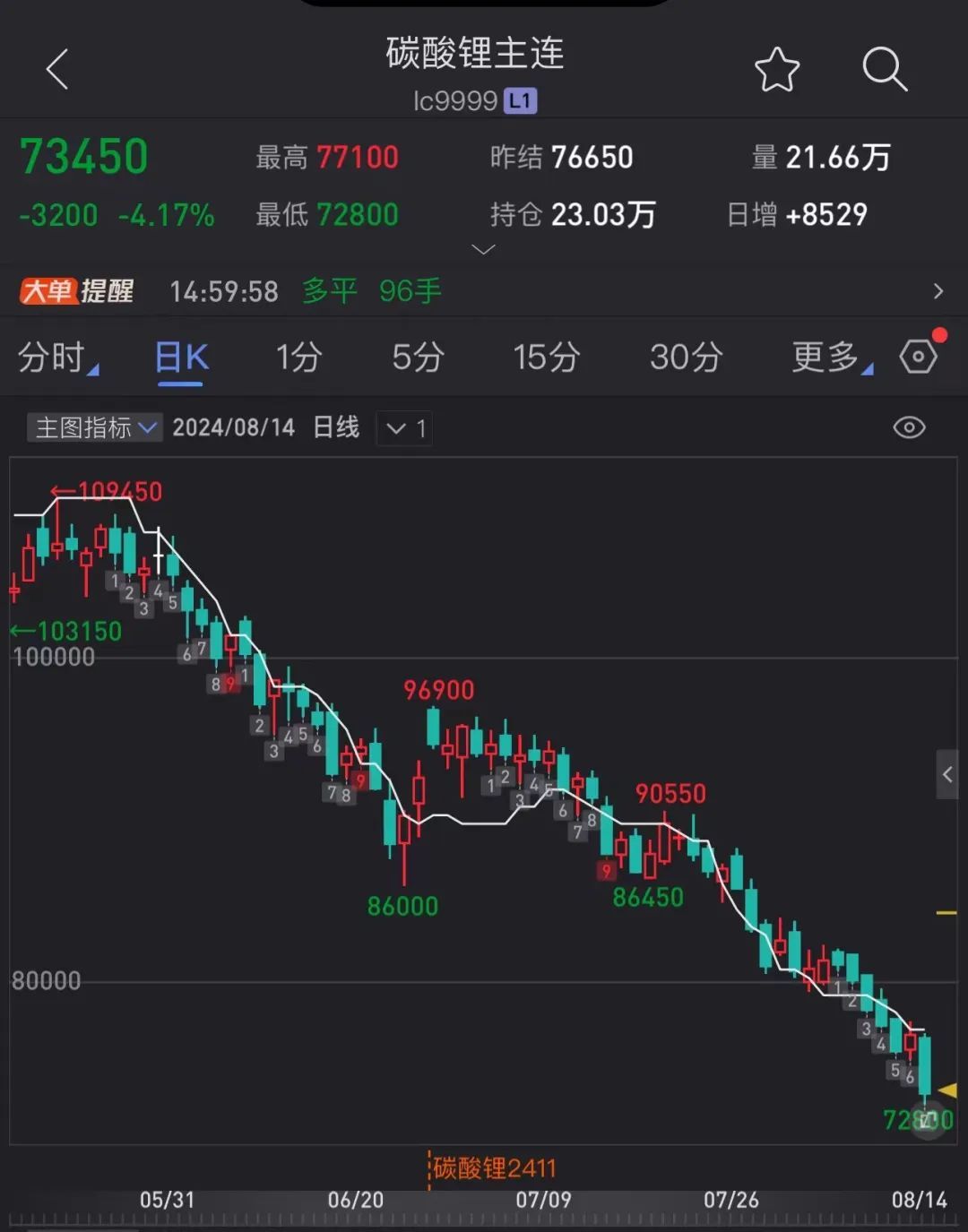 八月十四日,国内锂价格再次暴跌。碳酸锂期货主合约(lc2411)下跌3200元/吨,收跌至7.35万元/吨,跌幅达4.17%。