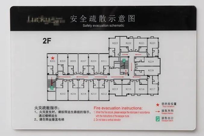 仔细检查并熟悉门后的疏散逃生路线图。最好自己沿着路线走,这样一旦发生火灾事故,可以在最短的时间内疏散到安全通道。